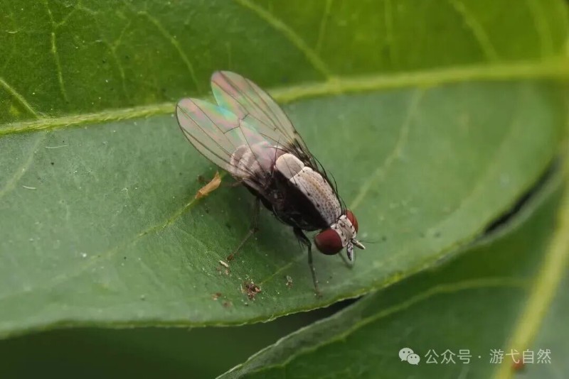 黑灰色的缟蝇,特征明显——就像从头顶到小盾片,刷了一条漆。本种嘎嘎昆虫网有收录,晓虫等小程序也能识别。
