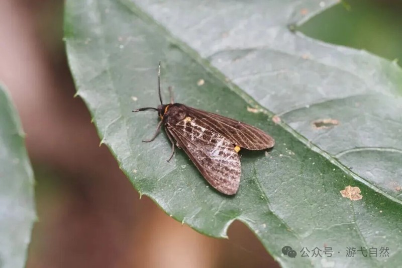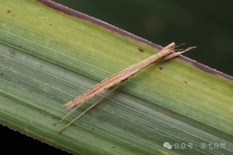草上一只平平无奇的裳蛾,前翅上各有两个小点,广东、云南和福建有记录。