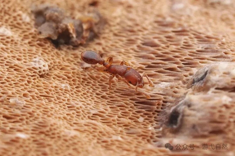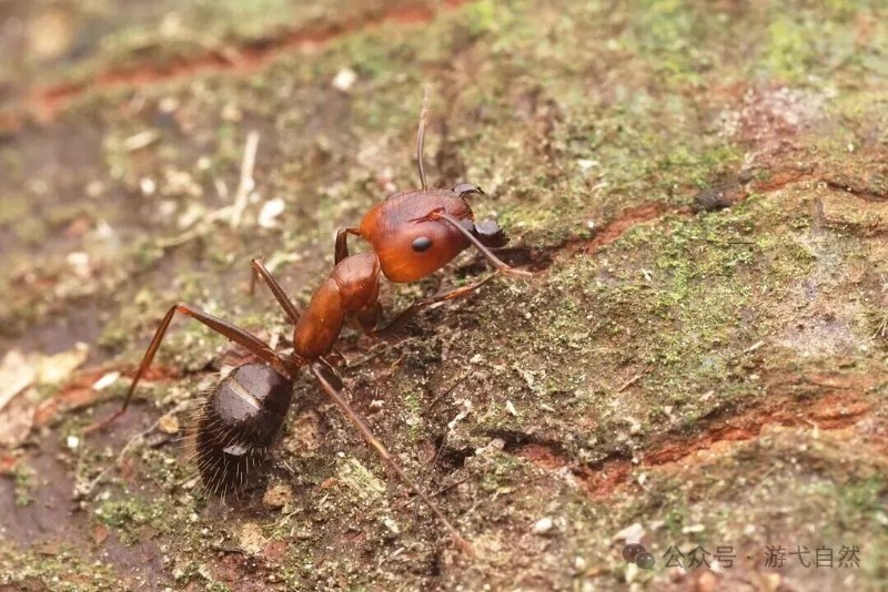 朽木上有蚂蚁前来巡逻,看上去像铺道蚁,但体扁而头长。